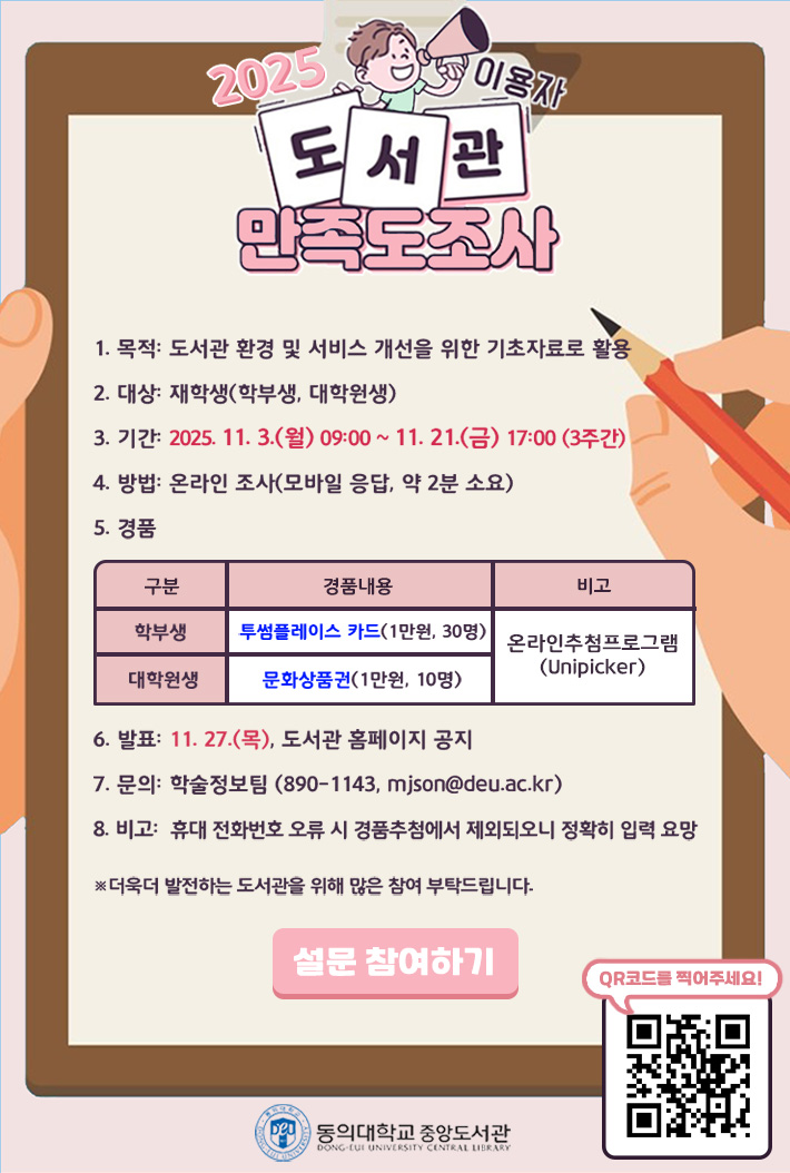 여 업무 개선에 적극 반영하고자 '2025년 도서관 이용자 만족도 조사'를 실시하오니