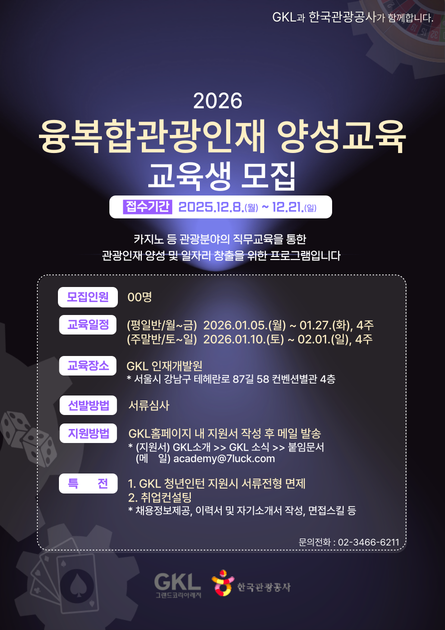 2026년 제1차 융복합관광인재양성교육 | 평일반 | 2026.1.5 ~ 1.27 | GKL 인재개발원 |