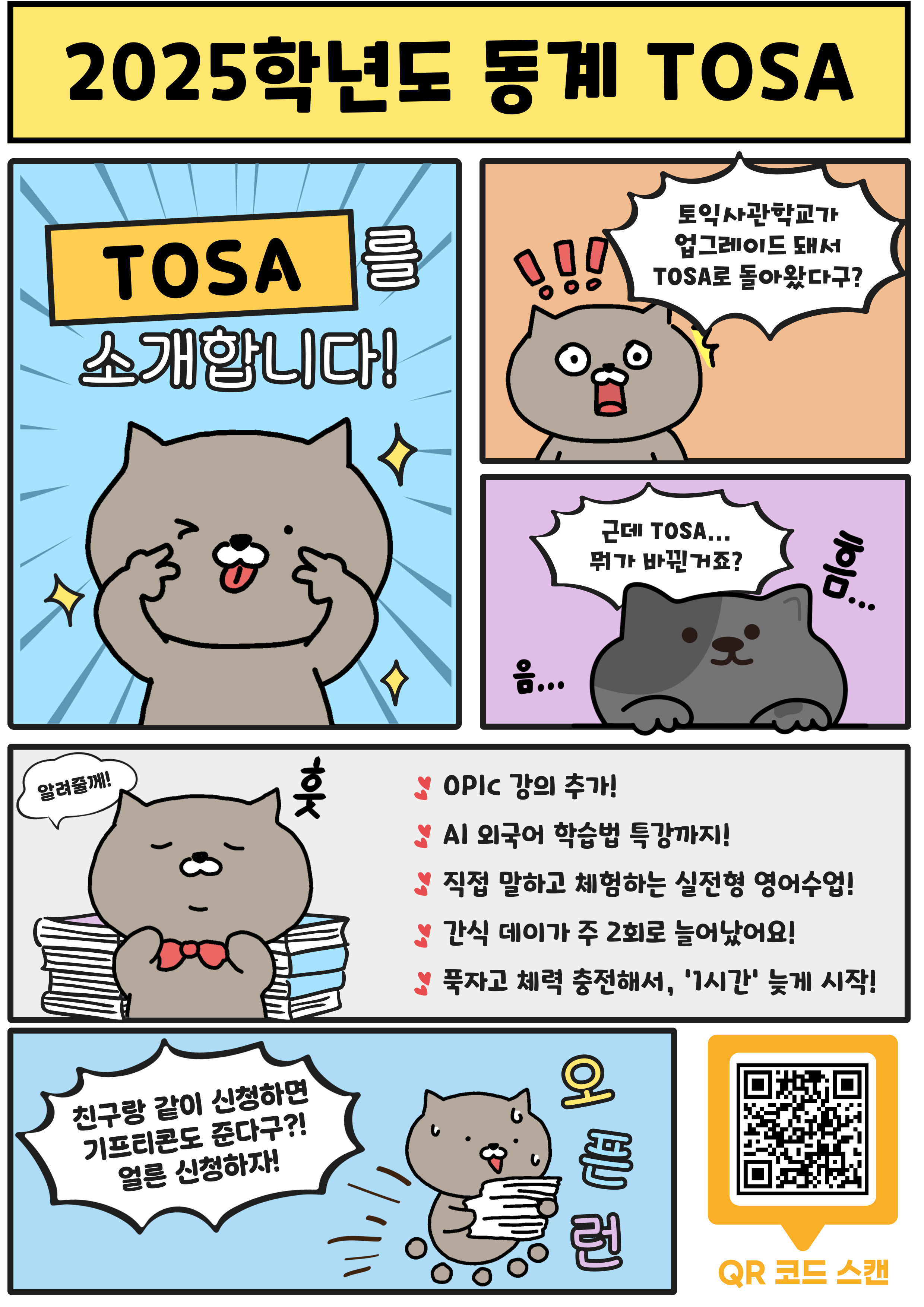 국제언어교육원에서는 재학생들의 영어 능력 향상을 위해 방학 중 영어 집중프로그램인「토익사관학교」를 운영하고 있습니다. 2025학년도 동계부터는 변화하는 취업 환경에 따라 학생들의 요구사항을 반영하여 「TOSA 프로그램」으로 변경 시행하오니, 각 학과(전공)에서는 많은 학생이 참가할 수 있도록 안내하여 주시기 바랍니다.